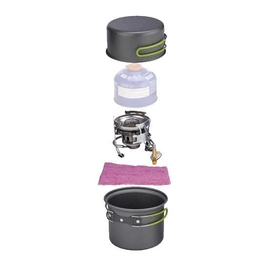 Мощность нагревателя оценивается в 1,4 киловатта. Расход топлива составляет 106 г/час. Для того, чтобы вскипятить один литр жидкости, потребуется пять минут и пятьдесят секунд. Нагреватель весит 310 грамм. Благодаря закрытому горению удаётся увеличить эффективность теплового воздействия на треть. Внутренняя сетка для камеры сгорания обеспечивает трансформацию пламени. За счёт чего получается равномерное нагревание. Верхние пазы нагревателя способствуют усилению трения. Подставка такова, что удаётся приспособиться к различным типам поверхности в том месте, где вы используете горелку. Она остаётся устойчивой. Кронштейн поддаётся свободному регулированию. Котлы и нагреватель позволяют облегчить кулинарную деятельность на свежем воздухе. В комплекте также имеется мягкая салфетка.