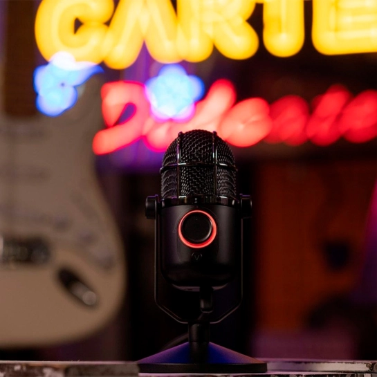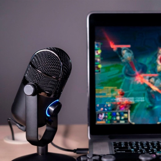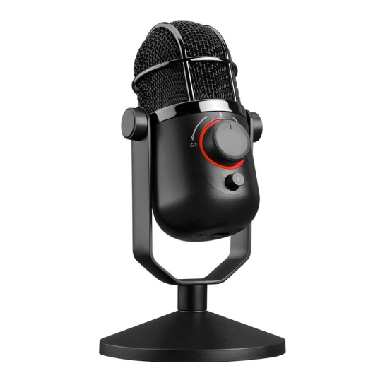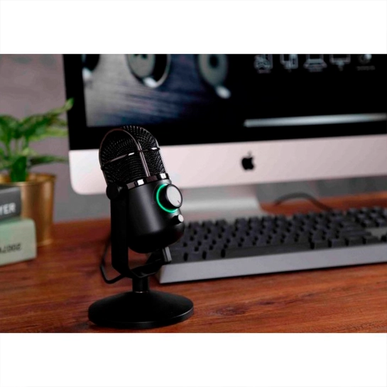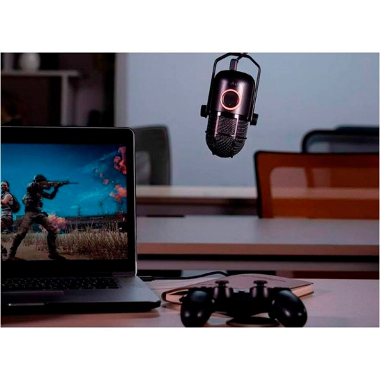 Металлический корпус микрофона сочетает прочность с элегантным дизайном, делая устройство не только надежным, но и визуально привлекательным. Настольная подставка обеспечивает устойчивое размещение и комфортный угол наклона для оптимальной записи. Встроенная подсветка подчёркивает современный характер микрофона и создаёт атмосферу профессионального сетапа.