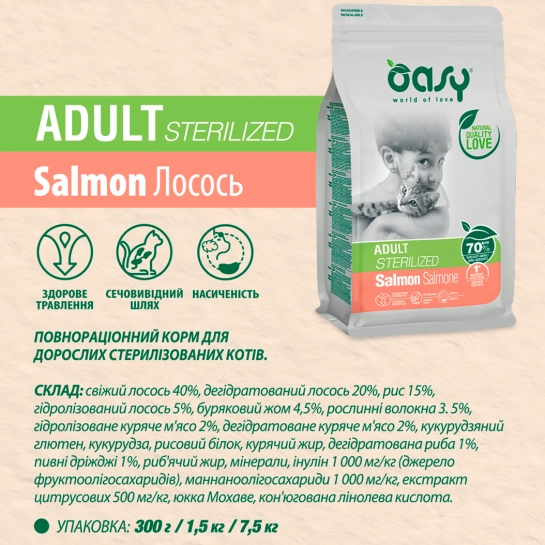 Характеристики для Корм для котов OASY LIFESTAGE Sterilized для стерилизованых кошек, с лососем, 7,5 кг (8053017348278)