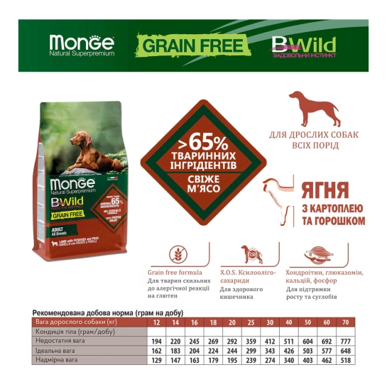 Характеристики для Корм для собак MONGE Dog Bwild Grain Free Ягнёнок 2.5 кг