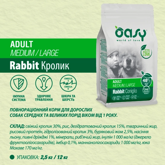Корм для собак OASY OAP ADULT Medium/Large для взрослых собак средних и больших пород, с кроликом, 18 кг (8053017349336)