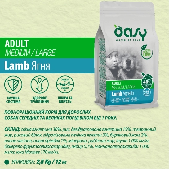 Корм для собак OASY OAP ADULT Medium/Large для взрослых собак средних и больших пород, с ягненком, 18 кг (8053017349329)