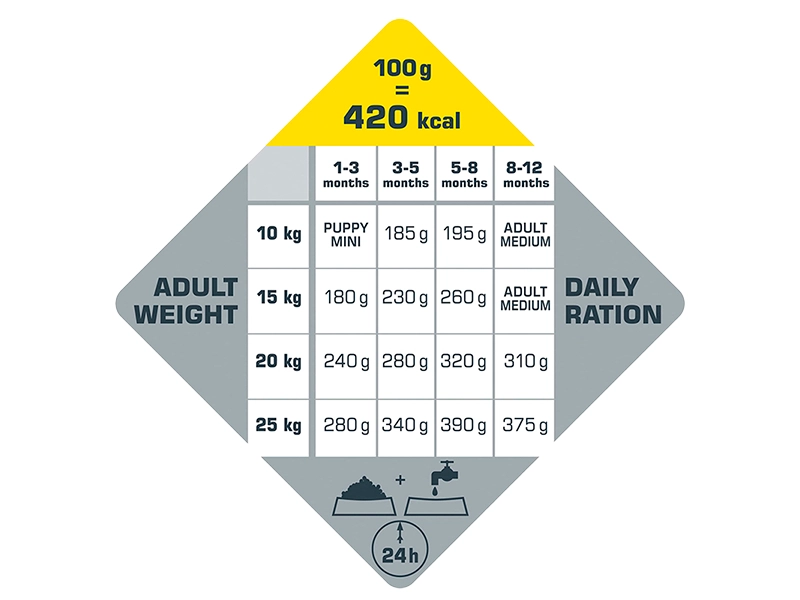 - специально разработанный для щенков средних пород (10-25 кг) с учетом потребностей их питания и развития;