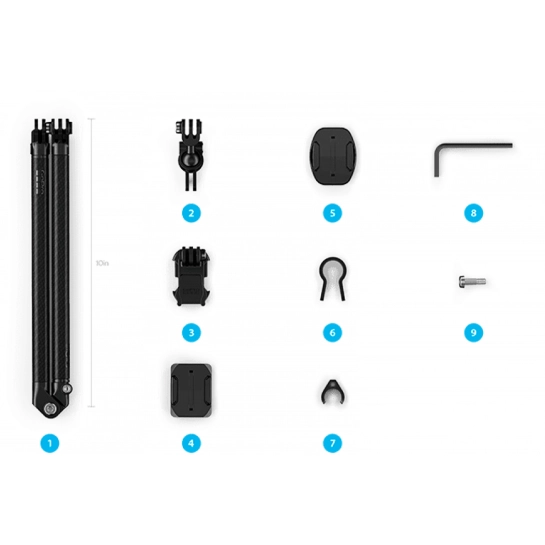 - Комплектация: 2 кронштейна из углеродного волокна 25,5 см, шарнирное крепление для камеры, профессиональное крепление на руль/подседельный штырь/шест, 5 переходников для штанги/штыря, изогнутые + плоские клеящиеся крепления, крепежная пряжка, опорный скользящий элемент, шестигранный ключ 4 мм, 2 дополнительных шестигранных винта, зажим для хранения шестигранных ключей, чехол на завязке.