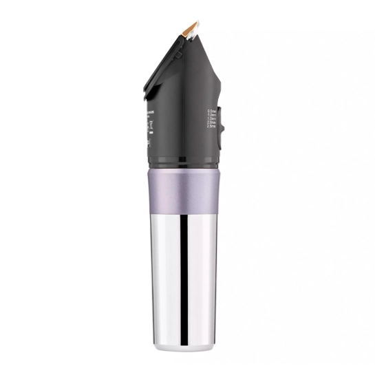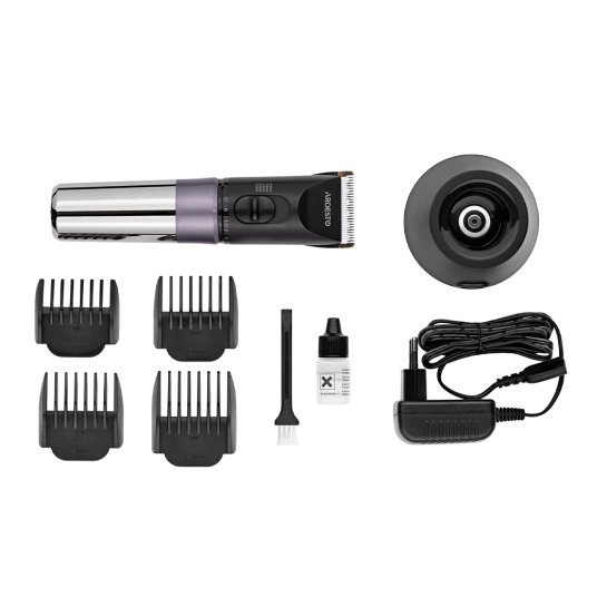 Комбинация лезвий, выполненных из керамики и нержавеющей стали, с титановым покрытием, обеспечивают аккуратность стрижки и долговечность заточки самих лезвий. Машинку также можно использовать без насадок в качестве триммера для более детальной проработки рисунка стрижки, с регулировкой длины от 0,5 до 2,5 мм. Дополнительные четыре насадки расширяют диапазон регулирования среза от 3 до 12 мм. Ручка с поддержкой вращения используется для включения и выбора скорости. Встроенный аккумулятор позволяет работать машинке 100 минут в автономном режиме, а время полной зарядки составляет 180 минут. На LED-дисплее отображается заряд, скорость и статус устройства. Для удобного хранения в горизонтальном положении в комплекте предусмотрена подставка-зарядная станция.