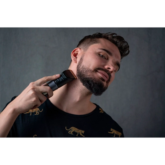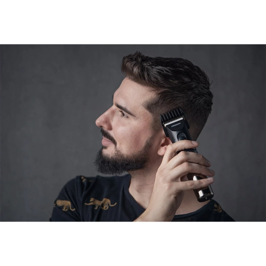 Компактная машинка для стрижки волос с керамическим лезвием, встроенным аккумулятором, LED-дисплеем и комплектом насадок. Корпус выполнен из пластика черного цвета и дополнен хромированной ручкой. Машинка также поддерживает функцию регулировки длины среза волос без использования насадок, а для удобного хранения в комплекте предусмотрена подставка-зарядная станция.