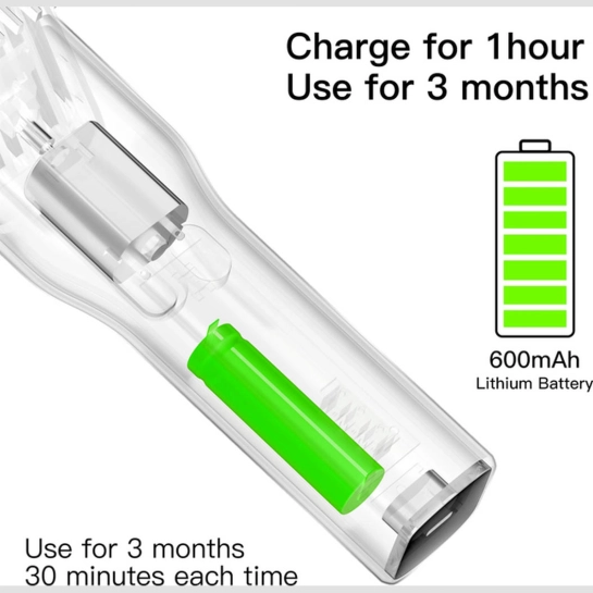 Машинка оснащена аккумулятором ёмкостью ≈ 600 мА·ч, который обеспечивает до ≈ 90 минут непрерывной работы на одном заряде. Полная зарядка занимает около 1,5 часа, а интерфейс USB-C позволяет подключить устройство к любому источнику питания — ноутбуку, адаптеру или внешнему аккумулятору. Благодаря этому Enchen Boost Set удобна в использовании как дома, так и в поездках.