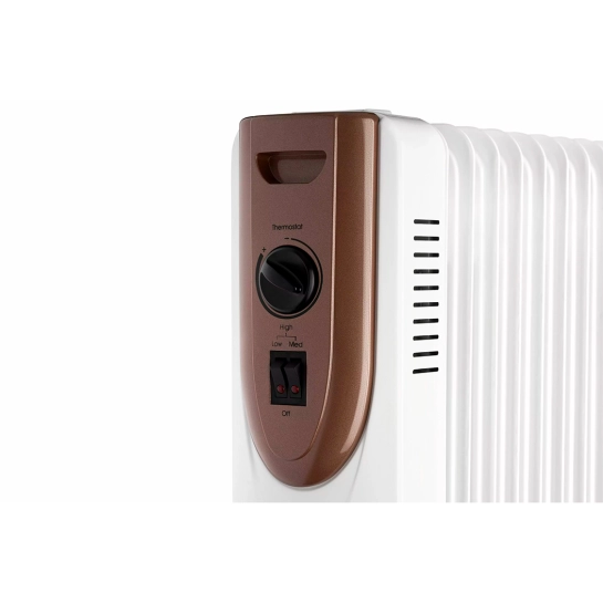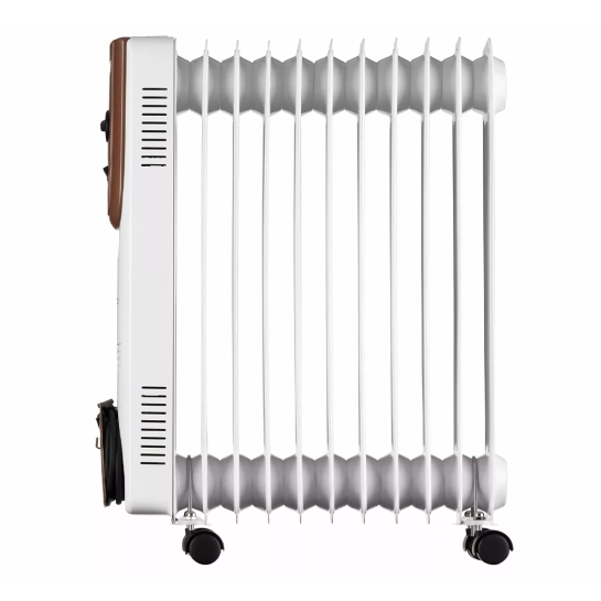 Масляный обогреватель с мощностью 2500 Вт на 11 секций и площадью обогрева до 25 м2. Для передвижения есть колесики и удобная ручка, шнур питания легко фиксируется на корпусе, а для безопасного использования предусмотрена защита от перегрева и датчик опрокидывания.