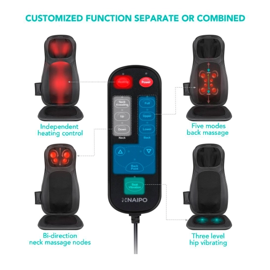 Накидка Naipo Neck and Back - функциональный аксессуар, который с легкостью превратит любое кресло в массажное, поможет избавиться от усталости и скованности, укрепит здоровье и поднимет настроение. Она сочетает в себе пользу разминающего массажа Шиацу, согревающее тепло и вибромассаж. Это лучший выбор для человека, который целый день работает в офисе, ведет сидячий образ жизни или проводит много времени за рулем. Naipo Neck and Back сделает массаж по-настоящему доступным и регулярным удовольствием.