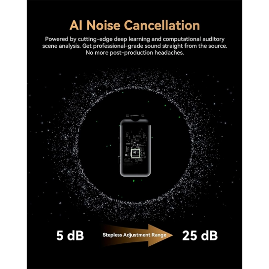 Встроенная технология шумоподавления эффективно устраняет фоновые шумы, такие как ветер, дорожный шум или гул помещения, сохраняя естественность голоса с регулировкой до 25 дБ. Функция таймкода на уровне кадра синхронизирует видео- и аудиозаписи через выходы 3,5 мм и UAC, облегчая работу в постпродакшене.