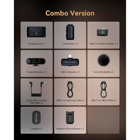 Версия Combo включает два компактных передатчика со встроенными всенаправленными микрофонами, камерный приемник и приемник с разъемом USB-C для подключения к Android-устройствам, iOS-гаджетам и компьютерам. Передатчики оснащены всенаправленными микрофонами с частотой дискретизации 48 кГц, 32-битной выборкой с плавающей запятой, отношением сигнал/шум 72 дБ и максимальным уровнем звукового давления 128 дБ, что обеспечивает насыщенный и чистый звук.