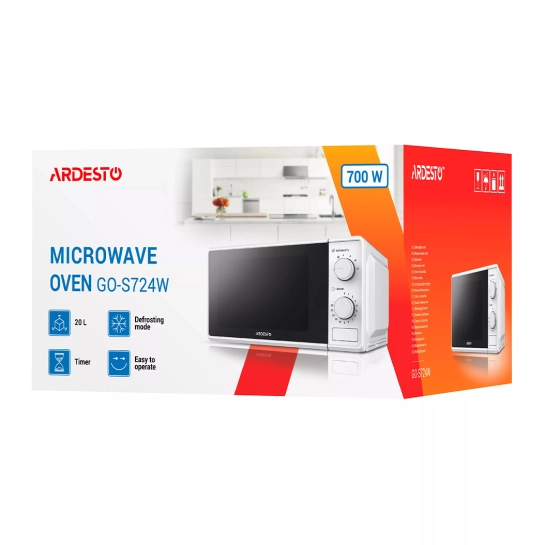 Микроволновая печь Ardesto GO-S724W разработана для бытового применения, за счет чего она хорошо приспособлена к установке на кухне, хорошо вписывается в интерьерные требования, а ее функционал адаптирован под использование для приготовления блюд самой разной рецептуры. Мощность данной модели может достигать 700 Вт, при этом в вашем распоряжении 6 уровней ее регулирования, за счет чего воздействие микроволн будет таким, как вы выберете.