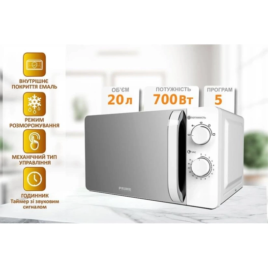 Микроволновая печь PRIME Technics PMW 20734 HW — ваш идеальный партнер на кухне, сочетающий в себе стильный дизайн и передовые технологии для облегчения повседневной жизни. Эта отдельностоящая модель с объёмом 20 литров создана специально для тех, кто ценит эффективность и удобство, предлагая оптимальное решение для разогрева и приготовления блюд.