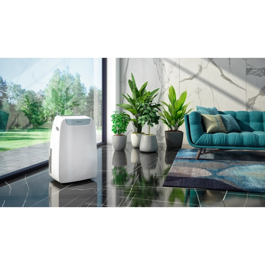 Кондиционер Olimpia Splendid DOLCECLIMA Air Pro – самое эффективное портативное устройство класса A++! Благодаря режимам осушения и вентиляции он не только охлаждает воздух, но обеспечивает комфортную влажность и циркуляцию. Модель оснащена WiFi, что позволяет управлять кондиционером из смартфона даже за пределами дома. Экологический хладагент R290 уменьшает влияние на окружающую среду, а встроенная технология Pro Power мощностью 2,4 кВт сделает кондиционер надежным союзником в борьбе за приятный микроклимат в комнате. Благодаря движущимся жалюзи в верхней части корпуса поток воздуха можно легко направлять в комнату. Электростатический фильтр предохраняет устройство от пыли, а фильтр с активированным углем устраняет неприятные ароматы. Компактный дизайн делает Olimpia Splendid идеальным выбором для домов, офисов и других помещений с ограниченным пространством.