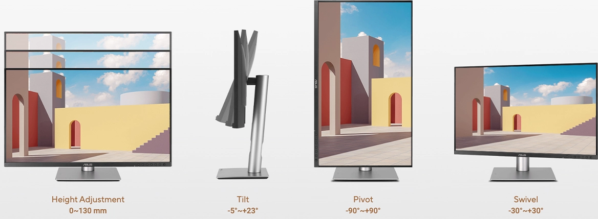 Подставка монитора поддерживает регулировку по высоте (0–130 мм), наклон (-5°~+23°), поворот (-30°~+30°) и вращение экрана на 90° в портретный режим.
