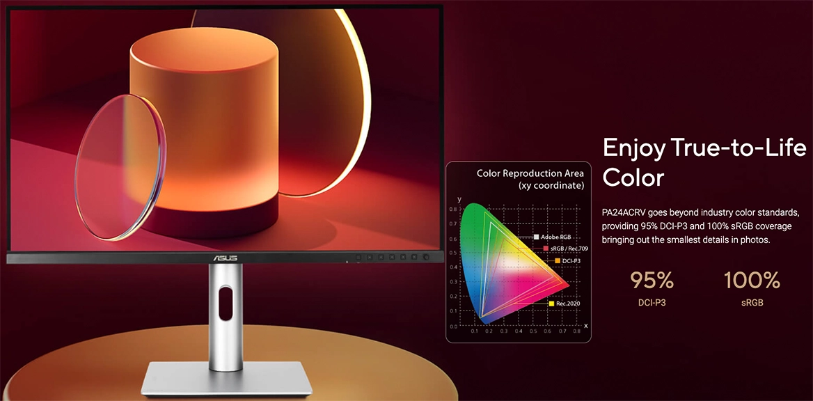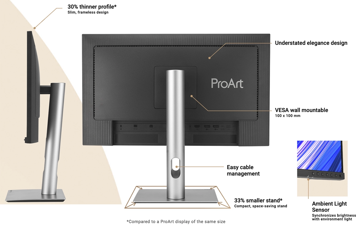 PA24ACRV имеет на 30 % тоньше профиль и 33 % меньшую подставку по сравнению с предыдущими моделями ProArt. Поддерживается крепление VESA (100 × 100 мм), предусмотрено удобное управление кабелями и автоматическая регулировка яркости благодаря встроенному датчику освещённости.