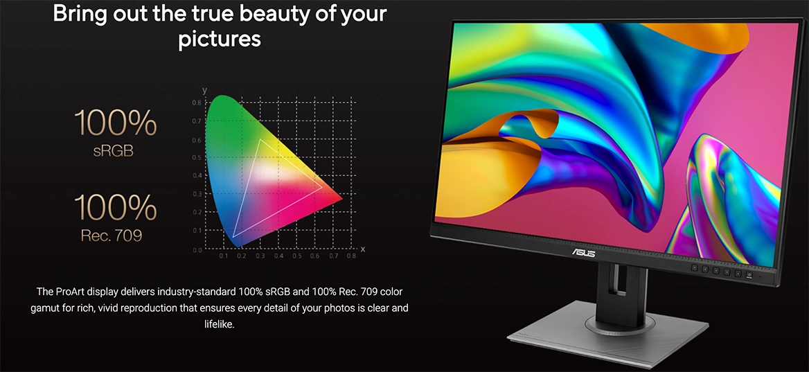 Покрытие 100% sRGB и 100% Rec.709 обеспечивает яркие, насыщенные цвета и точную передачу оттенков. Каждая деталь ваших фото и видео выглядит реалистично и естественно.