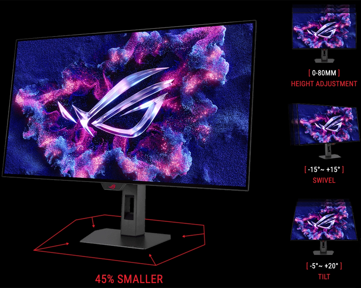 Подставка поддерживает регулировку высоты, наклона и поворота. Благодаря компактной конструкции она занимает на 45% меньше места, оставляя больше пространства для клавиатуры и периферии.