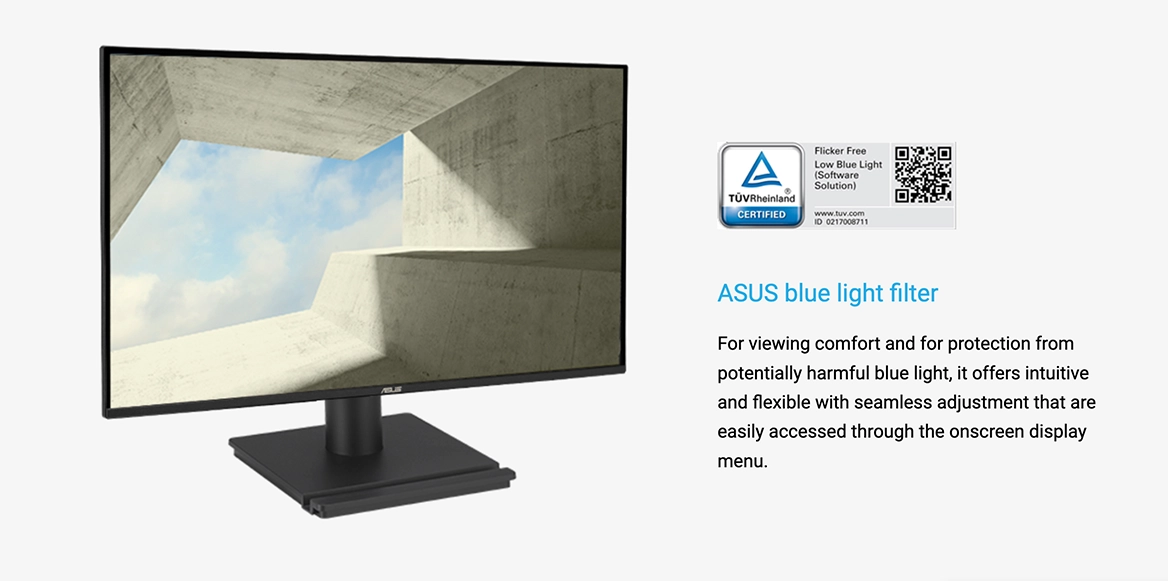 Монитор сертифицирован TUV Rheinland и оснащён технологией ASUS Eye Care, которая снижает нагрузку на глаза при длительном использовании. Она включает фильтр синего света для уменьшения вредного излучения и систему Flicker-Free для устранения мерцания, обеспечивая комфортное изображение даже при долгих рабочих или игровых сессиях.
