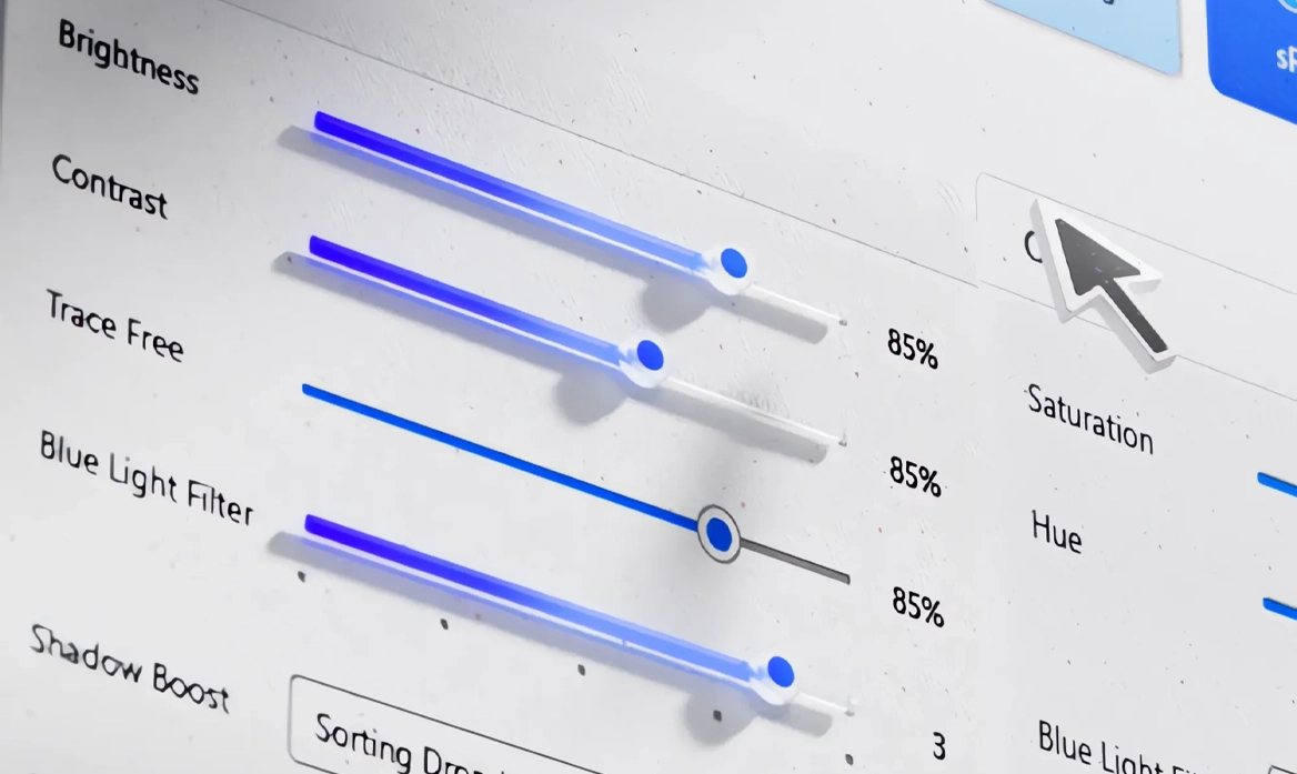 Интерфейс ASUS DisplayWidget позволяет легко регулировать яркость, контраст, насыщенность, фильтр синего света и другие параметры, адаптируя картинку под любые задачи — от работы до развлечений.