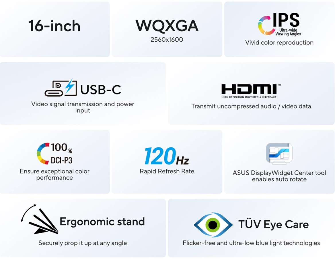Портативный монитор ASUS ZenScreen MB16QHG создан для того, чтобы играть, работать и отдыхать в любом месте. Его 16-дюймовый экран с разрешением WQXGA (2560×1600) обеспечивает невероятную чёткость, яркие цвета и частоту обновления 120 Гц для плавного изображения без задержек.