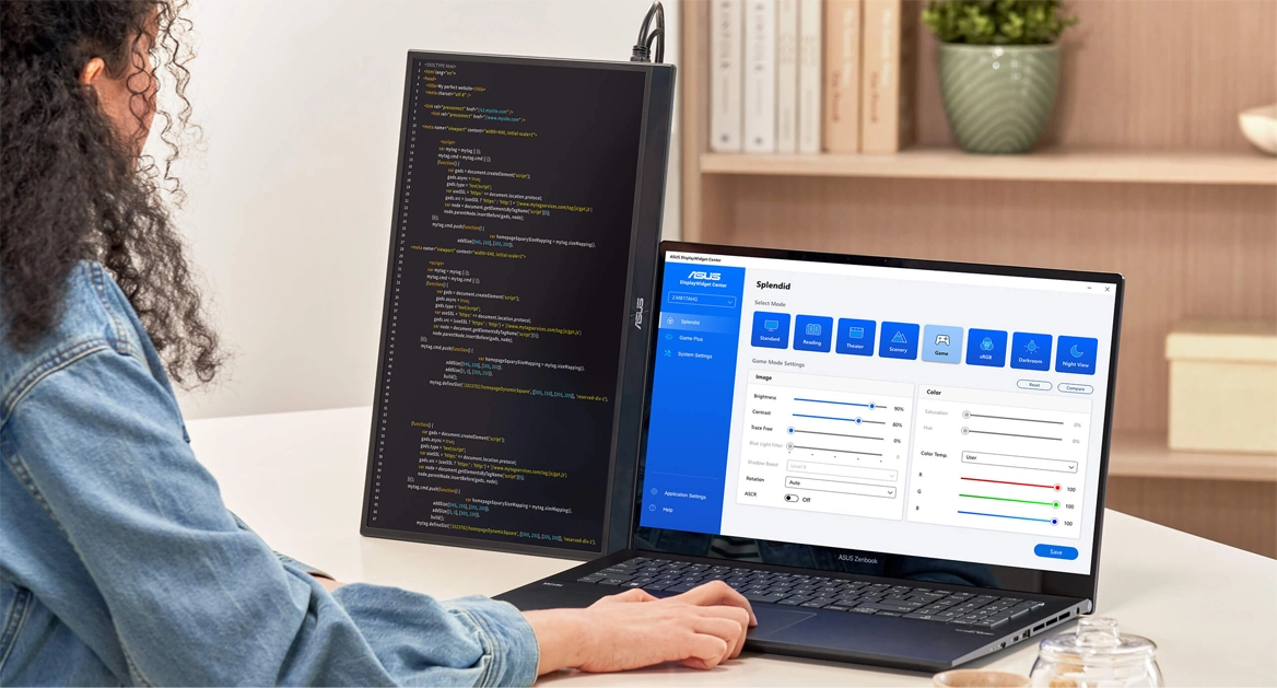 Подключив ZenScreen к ноутбуку, вы получаете второй экран для расширения рабочего пространства. Это повышает продуктивность, позволяет работать с несколькими приложениями одновременно и делает видеоконференции удобнее.