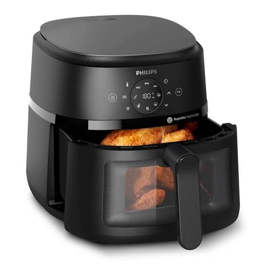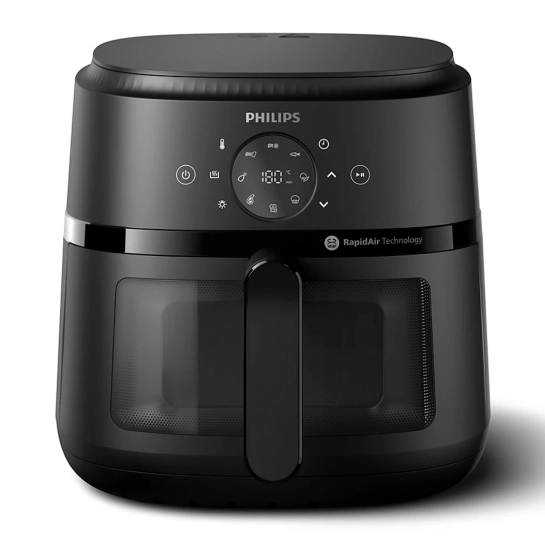 Компактный дизайн позволит легко найти для него место в кухне любого размера. В противень емкостью 6,2 литра можно загрузить до 800 г картофеля фри, 8 куриных ножек или 800 г овощей.