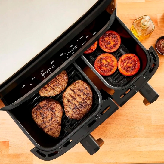 Мультипечь Tefal Dual Easy Fry EY901N10 открывает новые горизонты в приготовлении пищи благодаря своей уникальной двухкамерной конструкции. Оснащенная двумя независимыми ящиками – объемом 5,2 литра и 3,1 литра – она позволяет одновременно готовить два разных блюда, обеспечивая полноценный обед за один цикл. А также мультипечь позволяет готовить только в одной из них, в зависимости от ваших потребностей. Если вы хотите приготовить небольшую порцию или разогреть остатки пищи, можно активировать только одну камеру. Это идеальное решение для семей, которые ценят свое время и разнообразие в питании.