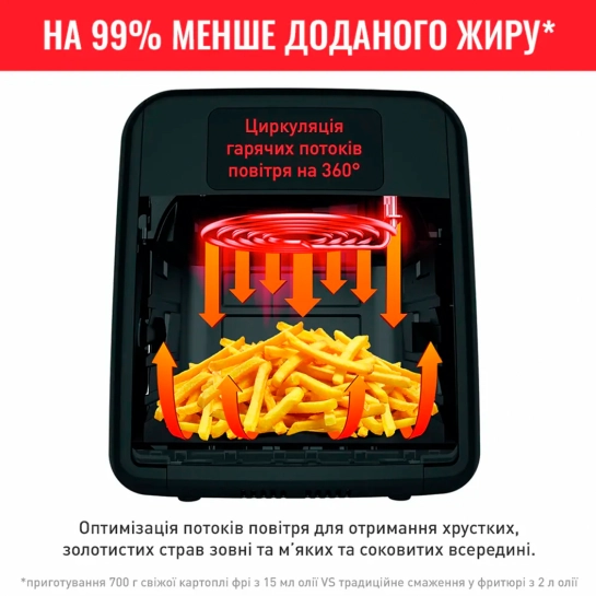 Оптимизация потоков воздуха для получения хрустящих, золотистых блюд снаружи и мягких и сочных внутри. По сравнению с традиционной жаркой во фритюре из 2 л растительного масла.