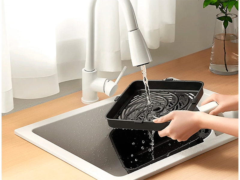 Корзина покрыта пищевым антипригарным покрытием, которое выдерживает 10 000 очисток. Оно устойчиво к появлению царапин и безопасно, что значительно упрощает очищение после использования.