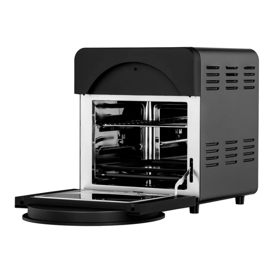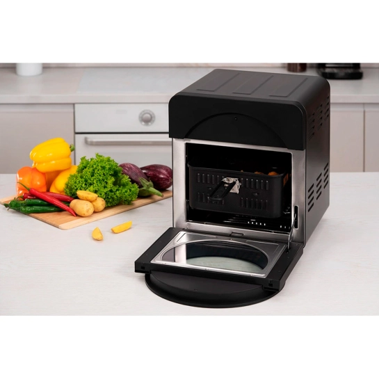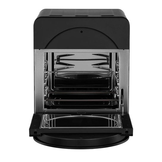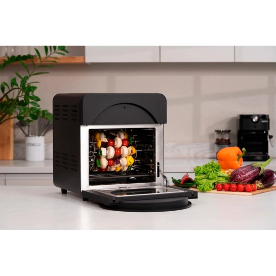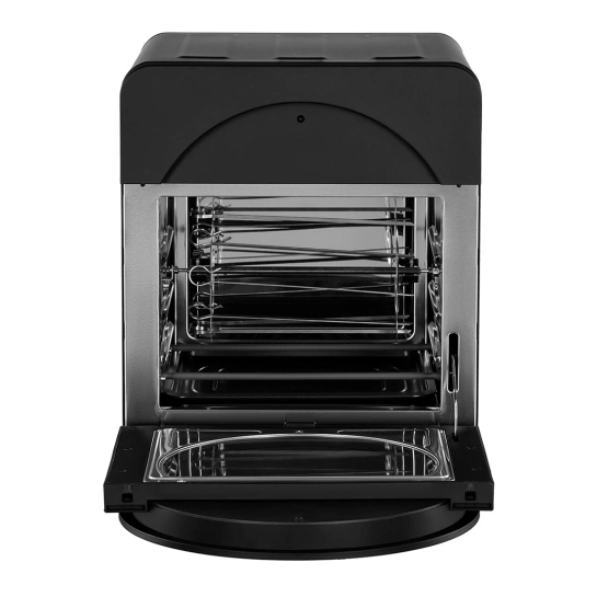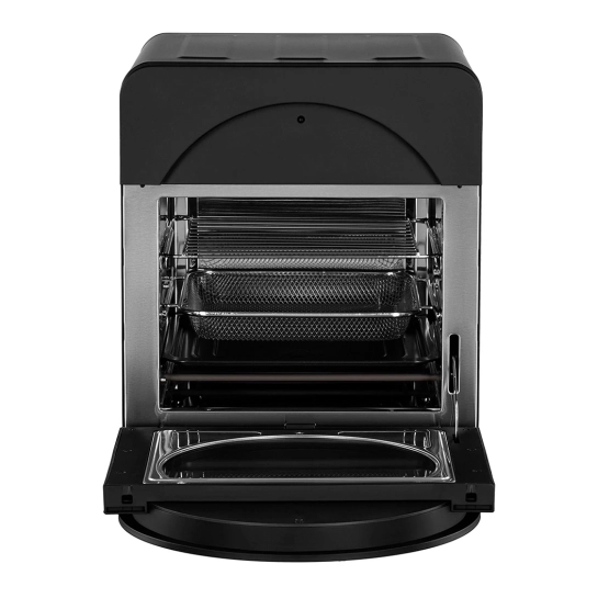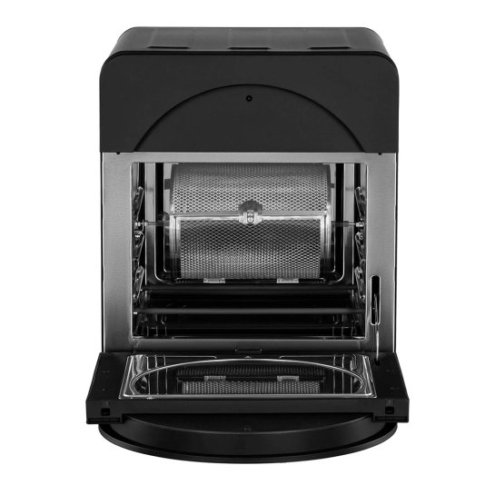 В комплекте предоставляется богатый набор аксессуаров: вертел, решетка для гриля, сетчатый противень, прямоугольная корзина с рукояткой, вращающаяся корзина, шашлычница, щипцы для вертела, поддон для сбора жидкостей и крошек.