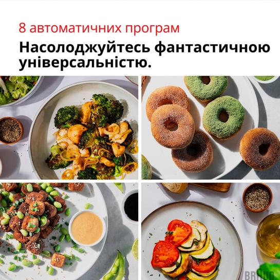 Автоматически устанавливайте время и температуру, чтобы легко и качественно готовить любимые блюда. Вкусные блюда готовятся, почти самостоятельно, благодаря автоматическим программам приготовления: замороженный картофель фри, картофель, овощи, курица, рыба, мясо, пирожные, разогрев.