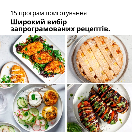 Интуитивно понятный экран с 15 автоматическими программами автоматически устанавливает правильное время и температуру для наилучших результатов.