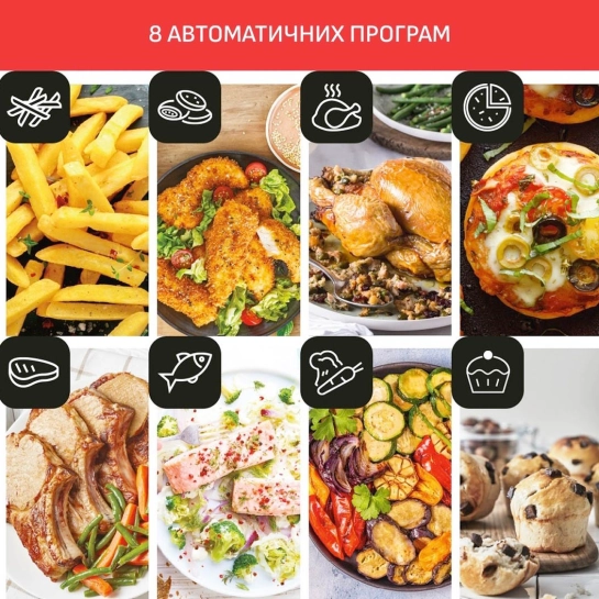 Для вашего удобства мультипечь оснащена 8 предустановленными программами: картофель фри, нагетсы, курица, пицца, мясо, рыба, овощи и десерты. Выберите нужный режим — и устройство автоматически установит оптимальные температуру и время приготовления.