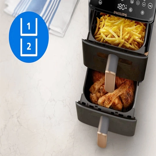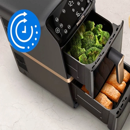 Интеллектуальная система автоматической синхронизации следит за тем, чтобы оба блюда были готовы одновременно — больше не нужно подгадывать время вручную. Смотровые окошки позволяют контролировать процесс без открытия корзин, а удобная функция «Время встряхнуть» подскажет момент, когда нужно перемешать содержимое для равномерного обжаривания.