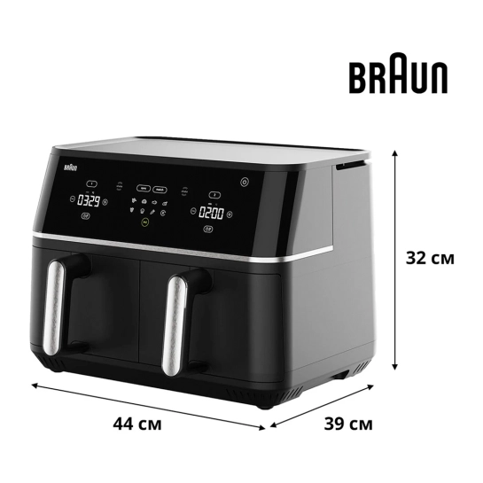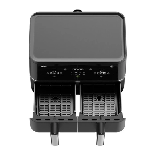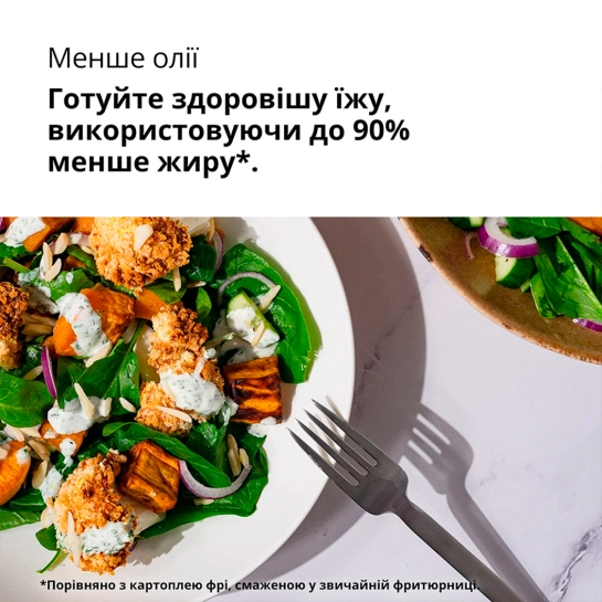 Благодаря мощности 2400 Вт и технологии RealAir поток горячего воздуха обеспечивает равномерное приготовление с минимальным количеством масла: до 90 % меньше жира, по сравнению с традиционной фритюрницей. При этом время приготовления на 50 % меньше, чем у стандартной духовки класса A. Керамическое антипригарное покрытие даёт превосходный результат, а съёмные корзины и решётки — лёгкую очистку и совместимость с посудомоечной машиной.