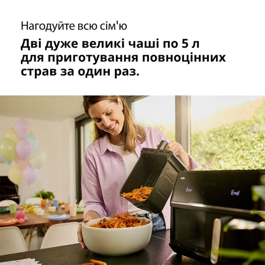 Мультипечь Braun TwinCook 5 TD 5030 IBK обладает системой Dual Serving: два объёма по 5 л (общий 10 л) позволяют одновременно готовить полноценное блюдо — например, 1,2 кг картофеля-фри (6 порций) и целую курицу весом 1,4 кг. Максимум мощности для домашнего использования.