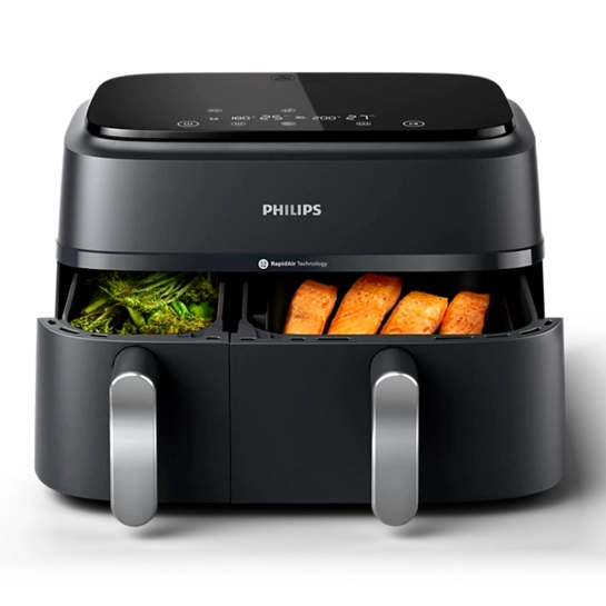 Мультипечь Philips серии 3000 с двумя корзинами гарантирует, что два блюда будут горячими и готовыми одновременно. Наслаждайтесь вкусной и здоровой пищей благодаря большой корзине для основных блюд для всей семьи и меньшей корзине для гарниров или отдельных блюд.