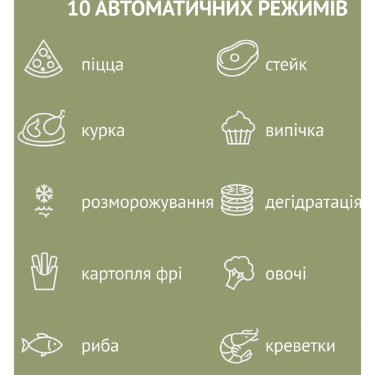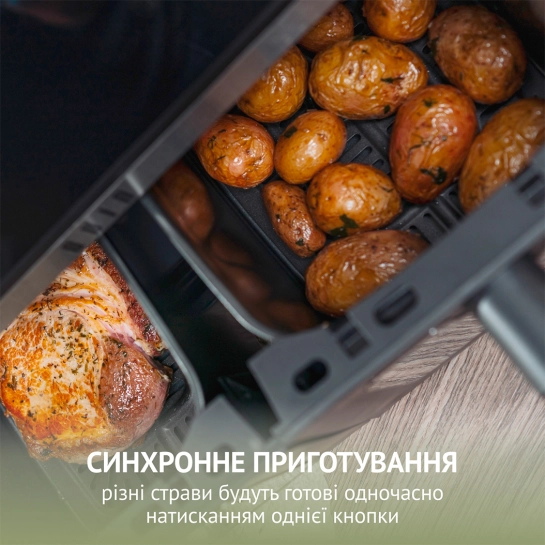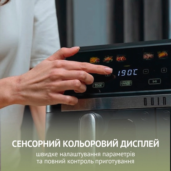Интуитивное сенсорное управление и цветной дисплей LED обеспечивают полный контроль над процессом. В QUIN Air Fryer Dual Zone YJ-1105A предусмотрено 10 автоматических программ приготовления: картофель фри, рыба, креветки, овощи, стейк или мясо, курица, пицца, выпечка, а также функции сушки (дегидратации) и размораживание. Вы можете самостоятельно регулировать температуру от 40°C до 230°C и устанавливать таймер до 60 минут. Особого внимания заслуживают интеллектуальные технологии: MATCH COOK позволяет мгновенно применить одинаковые параметры для обеих корзин, а SYNC FINISH синхронизирует время завершения приготовления различных продуктов, чтобы подать их на стол одновременно горячими.