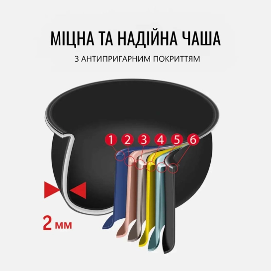 Большая прочная чаша. Надежная сферическая чаша толщиной 2 мм с 6 слоями, включая прочное и устойчивое к повреждениям антипригарное покрытие. Большой объем чаши - 5 л.