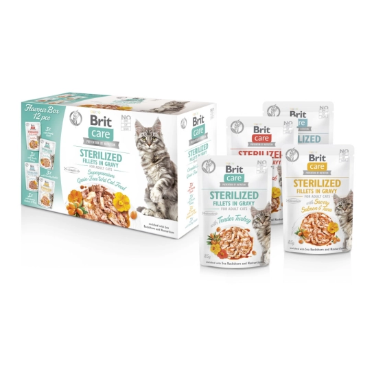 Набор влажных кормов для стерилизованных кошек Brit Care Flavour Box Sterilized филе в соусе, паучи 12 х 85 г (101048)