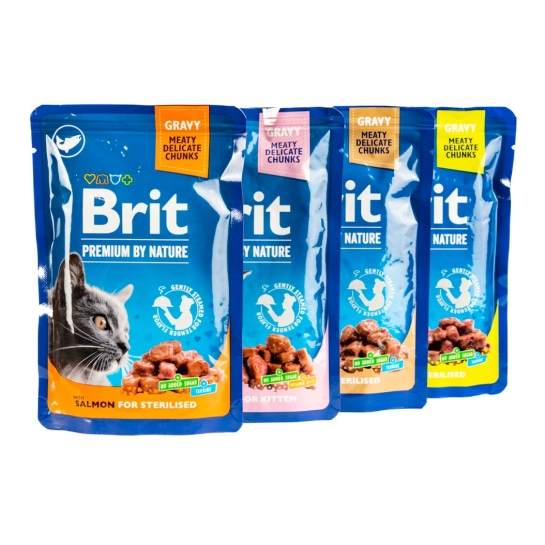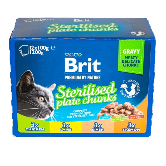 Характеристики для Набор влажных кормов для стерилизованных кошек Brit Premium Cat Family Plate ассорти из 4 вкусов, паучи 12 х 100 г (111834)