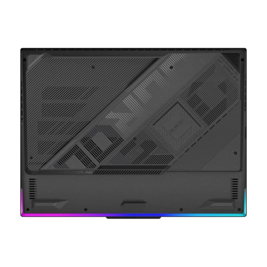 Ноутбук 2025 ROG Strix G16 оснащен RGB-подсветкой, которая обрамляет всю нижнюю панель корпуса, создавая яркое свечение на столе. Эта подсветка может