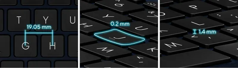 0,2-мм углубления на колпачках клавиш спроектированы таким образом, чтобы форма клавиш соответствовала форме кончиков пальцев: такая форма нежно направляет палец к идеальной точке контакта с клавишей.