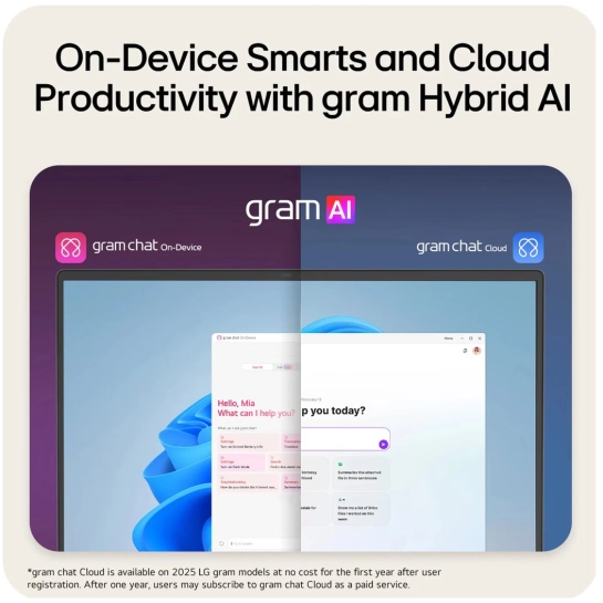 LG Gram теперь включает гибридное решение искусственного интеллекта, которое сочетает интеллект устройства с возможностями облачного искусственного интеллекта. GramChat On-Device управляет локальными задачами, такими как интеллектуальный поиск на жестком диске и настройка системы, а Gram chat Cloud предоставляет генеративные ответы искусственного интеллекта для создания документов, анализа данных и административных задач, таких как планирование — все это с помощью интуитивных взаимодействий.