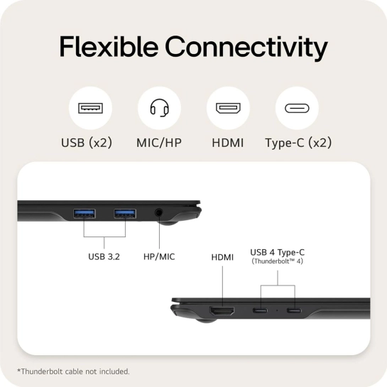 LG Gram Pro 16 оснащен современными интерфейсами: двумя портами USB 4 Gen3x2 Type-C (с поддержкой Thunderbolt 4, DisplayPort и Power Delivery), двумя портами USB 3.2 Gen1, HDMI 2.1 и комбинированным аудиоразъемом. Высокоскоростной Wi-Fi 7 и Bluetooth 5.4 гарантируют мгновенную связь с любыми устройствами.