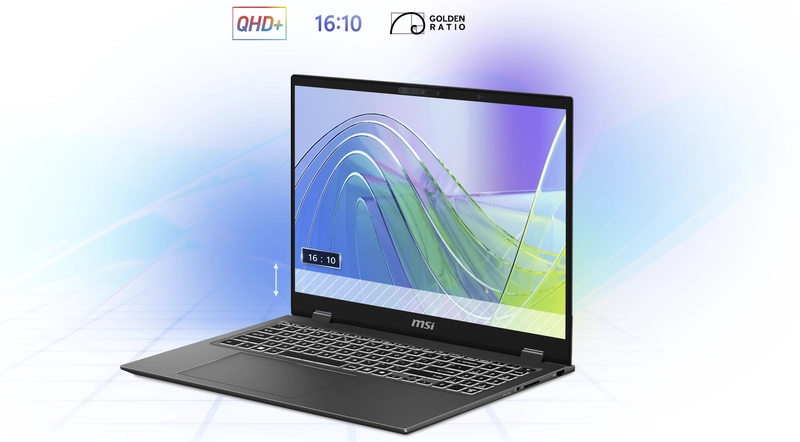 Prestige 16 AI Evo B1M оснащен ультратонкими рамками и дисплеем с соотношением сторон 16:10 и позволяет создать более просторное рабочее пространство для повышения производительности.