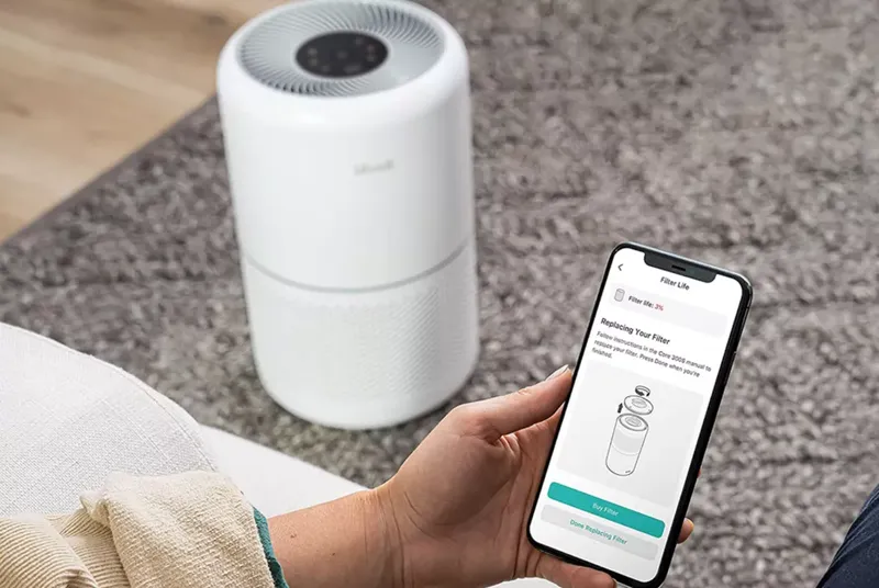 Очиститель Levoit Smart Air Purifier Core 300S оснащен специальным датчиком на базе искусственного интеллекта, который автоматически сканирует степень загрязненности воздуха и уменьшает, увеличивает или оставляет неизменной мощность девайса. Данные о состоянии воздуха в помещении вы увидите в фирменном мобильном приложении.