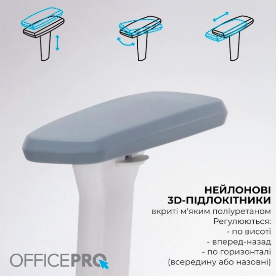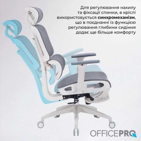 Регулируемая поясничная поддержка обеспечивает эргономично правильное положение спины, чтобы предотвратить перенапряжение при длительном сидении. Угол наклона и высота подголовника регулируется для оптимального позиционирования. А благодаря регулировке спинки высотой вы можете настроить удобное положение спинки для своего роста. Нейлоновые 3D подлокотники, покрытые мягким полиуретаном, регулируются по высоте, вперед-назад и изменяют угол поворота по горизонтали (наружу или внутрь). Для регулировки наклона и фиксации спинки в кресле используется синхромеханизм, который в сочетании с функцией регулировки глубины сиденья придает еще больше комфорта.