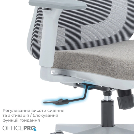 Кресло имеет нейлоновые 3D-подлокотники, обитые мягким полиуретаном, которые регулируются по высоте, вперед-назад, а также по горизонтали. Синхронный механизм наклона (синхромеханизм) позволяет фиксировать спинку в трех положениях, а функция регулировки высоты сиденья и качания обеспечивает дополнительные возможности персонализации во время работы.